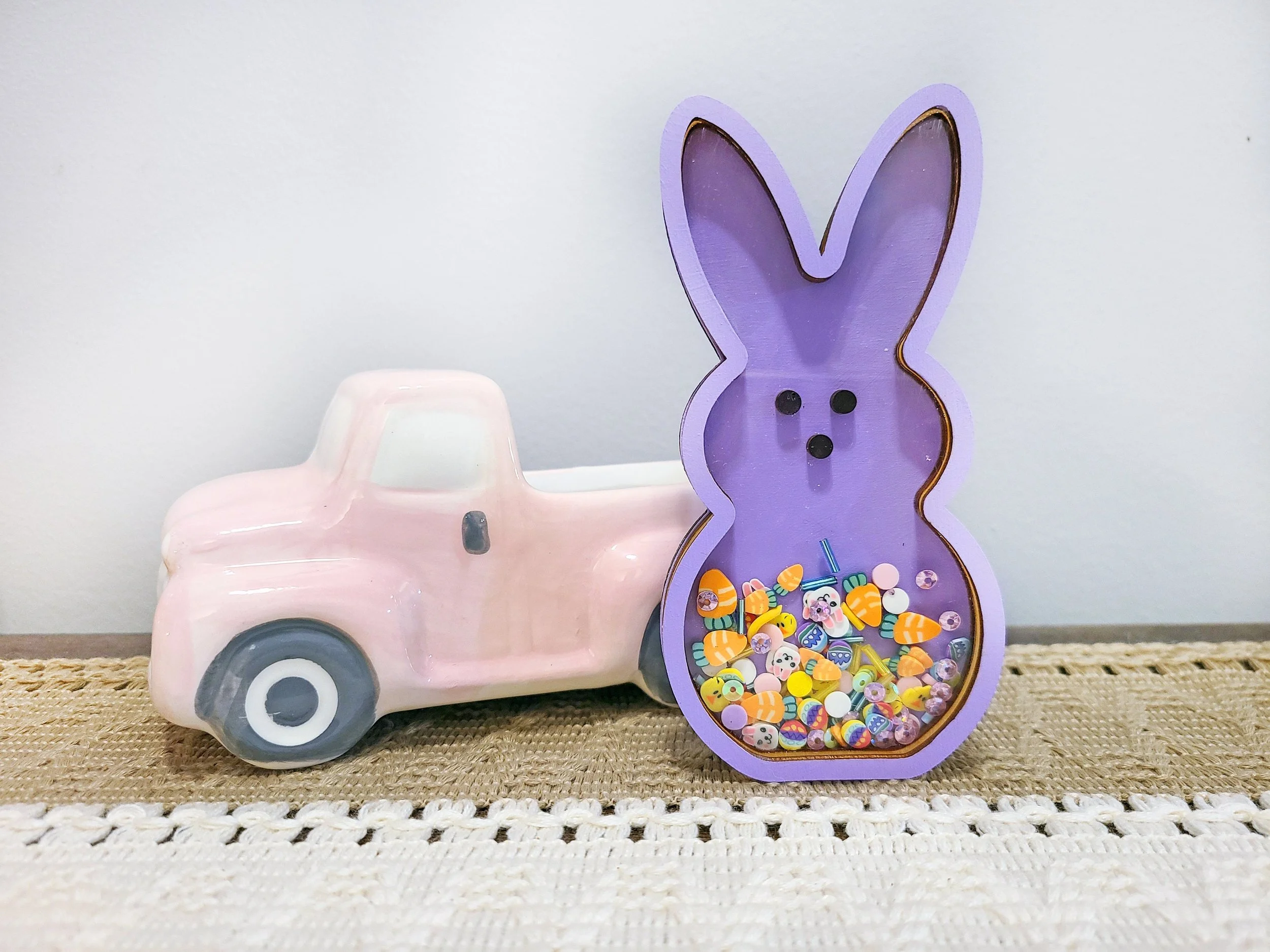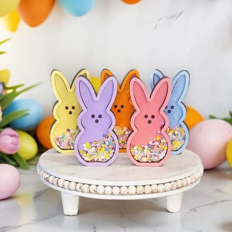 Elevate your seasonal decor with this adorable Peep Bunny Shaker Sign — a perfect centerpiece for Easter tables, shelves, or tiered trays that will surely bring smiles and cheer!