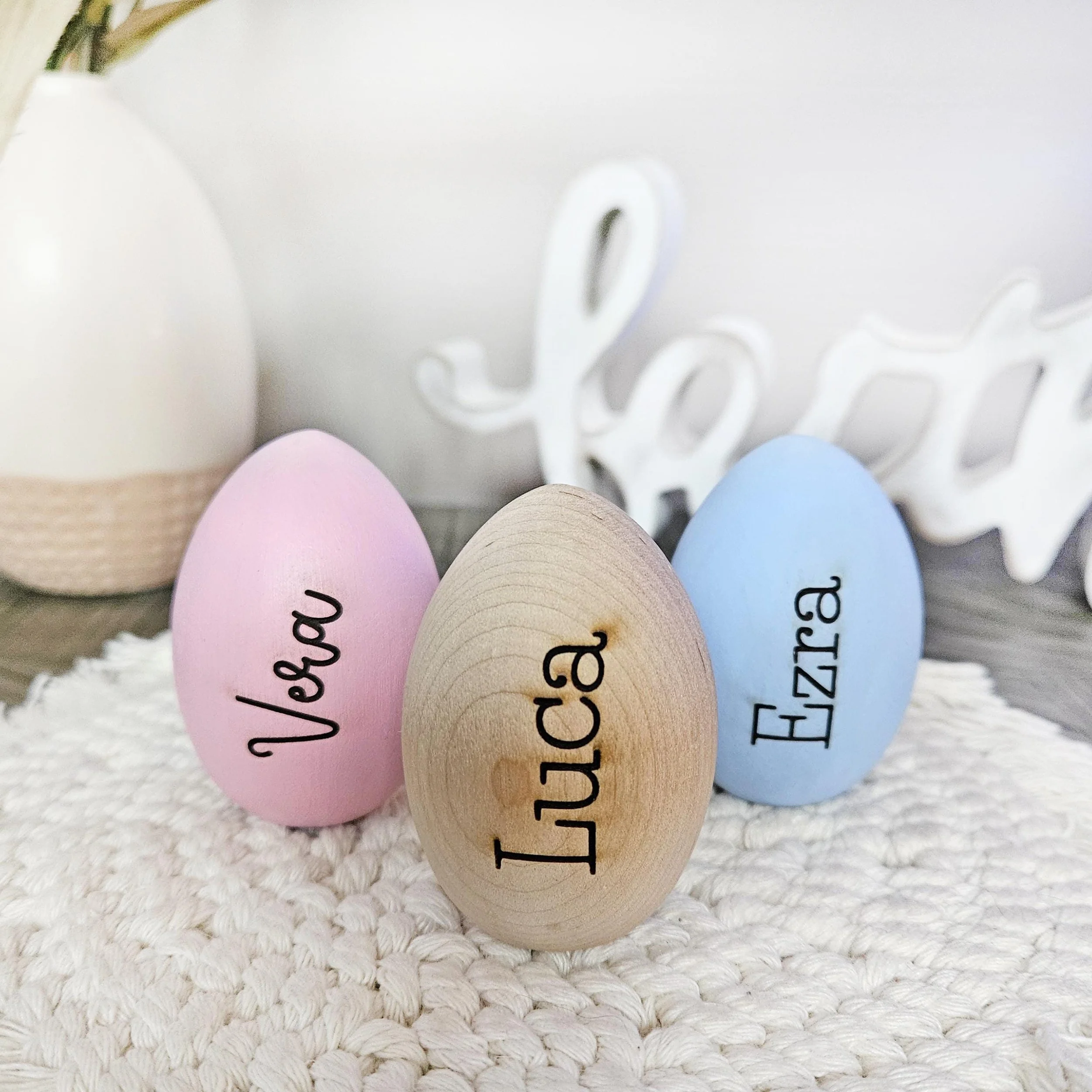 Celebrate Easter with a personalized touch using our charming engraved wooden Easter egg decor! These handcrafted eggs are the perfect addition to your spring table, Easter basket fillers, or as memorable Easter holiday decor. Each wooden egg is carefully painted and customized with a name or message of your choice, making it a special keepsake for kids and adults alike.
